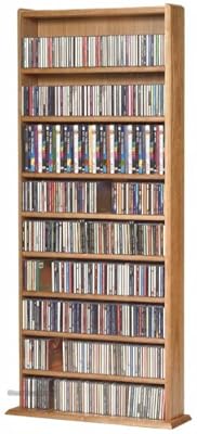 This Solid Hardwood CD, DVD, Video Storage Wall Unit holds: 600 CDs or 301 DVDs or 168 Videotapes or any combination of these. Also great storage for CD-ROMs and video game cartridges. It comes with 9 solid hardwood, adjustable shelves so that you can customize to fit your collection and optimize storage. Constructed of solid American Ash in a beautiful oak finish. Matching back panels included. Heavy-duty constructio...More>>>